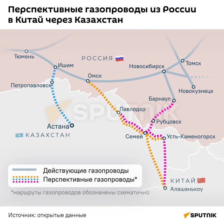 Газ из РФ в Китай может пойти транзитом через Казахстан. Рассматриваются два потенциальных новых маршрута, которые газифицируют Казахстан: