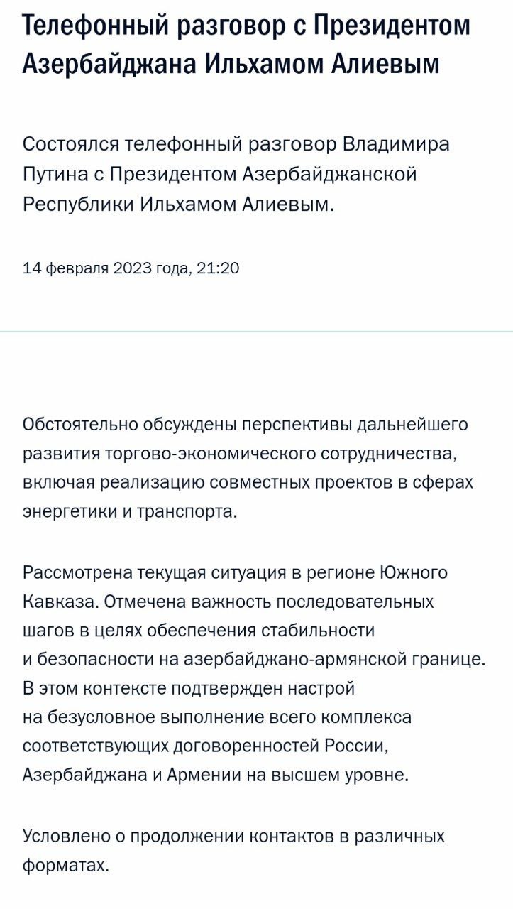 🇦🇿🇷🇺 Состоялся телефонный разговор между президентами АР и РФ, в ходе которого были обсуждены азербайджано-армянские отношения. Стороны также обсудили торгово-экономическое сотрудничество и совместные проекты в сферах энергетики и транспорта (сайт президента АР).