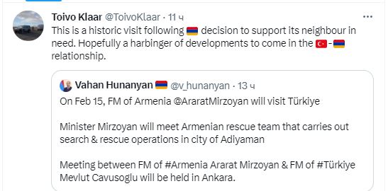 🇪🇺 Спецпредставитель ЕС по Южному Кавказу Клаар прокомментировал предстоящий визит главы МИД Армении Мирзояна в Турцию: «Это исторический визит, последовавший за решением поддержать своего нуждающегося соседа. Надеюсь, это предвестник грядущего развития отношений Турция-Армения» (Twitter-аккаунт Клаара).