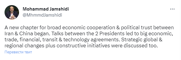 Заместитель по политическим вопросам Офиса Президента Ирана Мохаммад Джамшиди: «Началась новая глава обширного экономического сотрудничества и взаимного политического доверия между Ираном и Китаем.