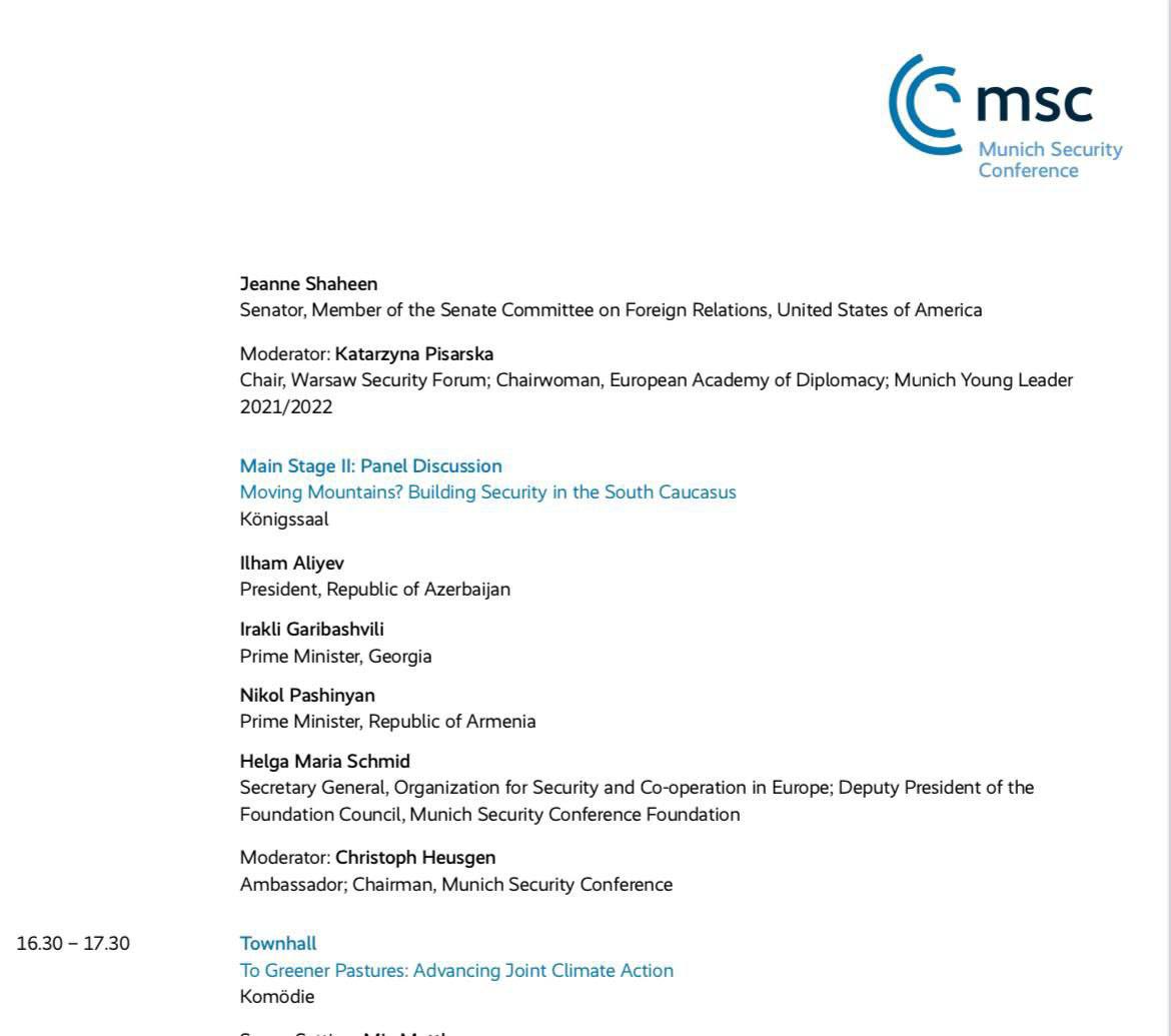 🇦🇿🇬🇪🇦🇲 Пашинян включен в программу сегодняшней панельной дискуссии Мюнхенской конференции с участием Ильхама Алиева и Ираклия Гарибашвили.