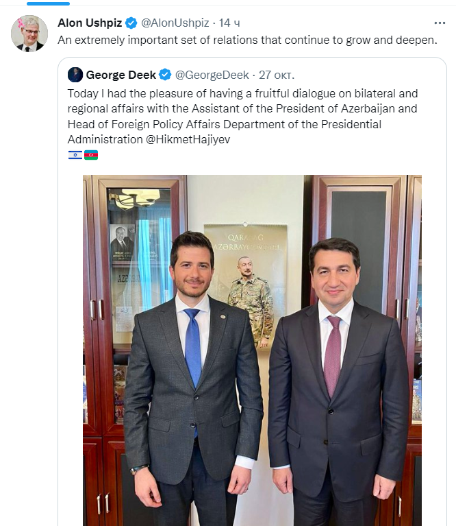 «Чрезвычайно важный комплекс отношений, которые продолжают укрепляться и углубляться» (гендиректор МИД Израиля о встрече помощника Президента АР с послом Израиля).