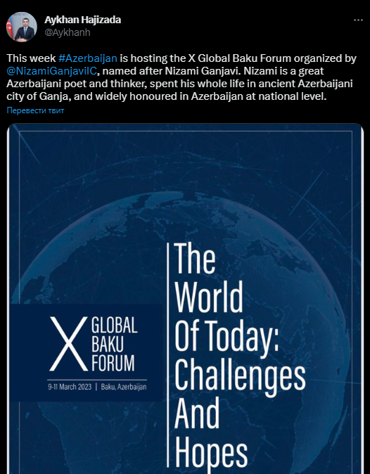 «На этой неделе в АР пройдет Х Global Baku Forum, организованный Международным центром Низами Гянджеви. Низами – великий азербайджанский поэт и мыслитель, всю жизнь проживший в древнем азербайджанском городе Гянджа, широко почитаемый в Азербайджане на национальном уровне» (Twitter-аккаунт Гаджизаде).