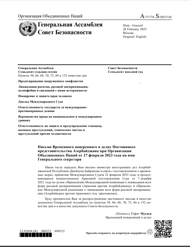 В письме главы МИД АР, адресованному генсеку ООН Гутерришу в связи с решением Международного суда от 22 февраля 2023 г., подчеркиваются нарушения Арменией предыдущего постановления (сайт МИД АР).