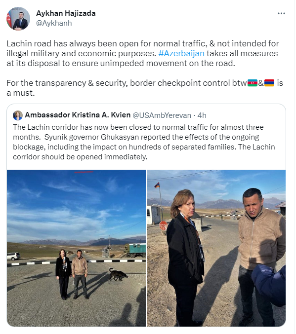 Глава пресс-службы МИД АР ответил послу США в Армении, которая потребовала «открытия» Лачинской дороги. Он подчеркнул, что дорога всегда была открыта для свободного передвижения и не предназначалась для незаконных военных целей.