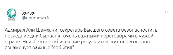 🇮🇷 Иранский новостной сайт Nour News, связанный с Высшим советом национальной безопасности Ирана, заявил в своем Twitter-аккаунте, что Секретарь совета Али Шамхани за последние дни провел «ряд важных переговоров в чужой стране». Авторы пообещали, что объявление результатов этих переговоров «ознаменует важные события».