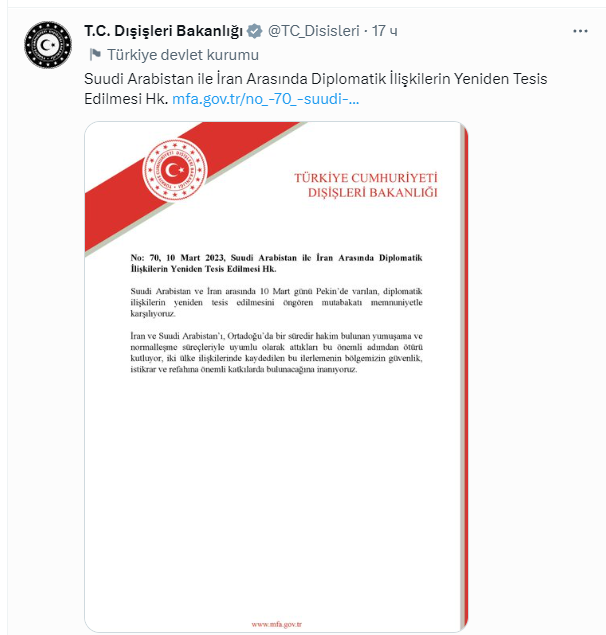🇹🇷🇸🇦🇮🇷 В Турции заявили о важности примирения Тегерана и Эр-Рияда: «Возобновление отношений между Ираном и Саудовской Аравией является важным шагом, который поспособствует усилению безопасности и стабильности в регионе» (Twitter-аккаунт МИД Турции).