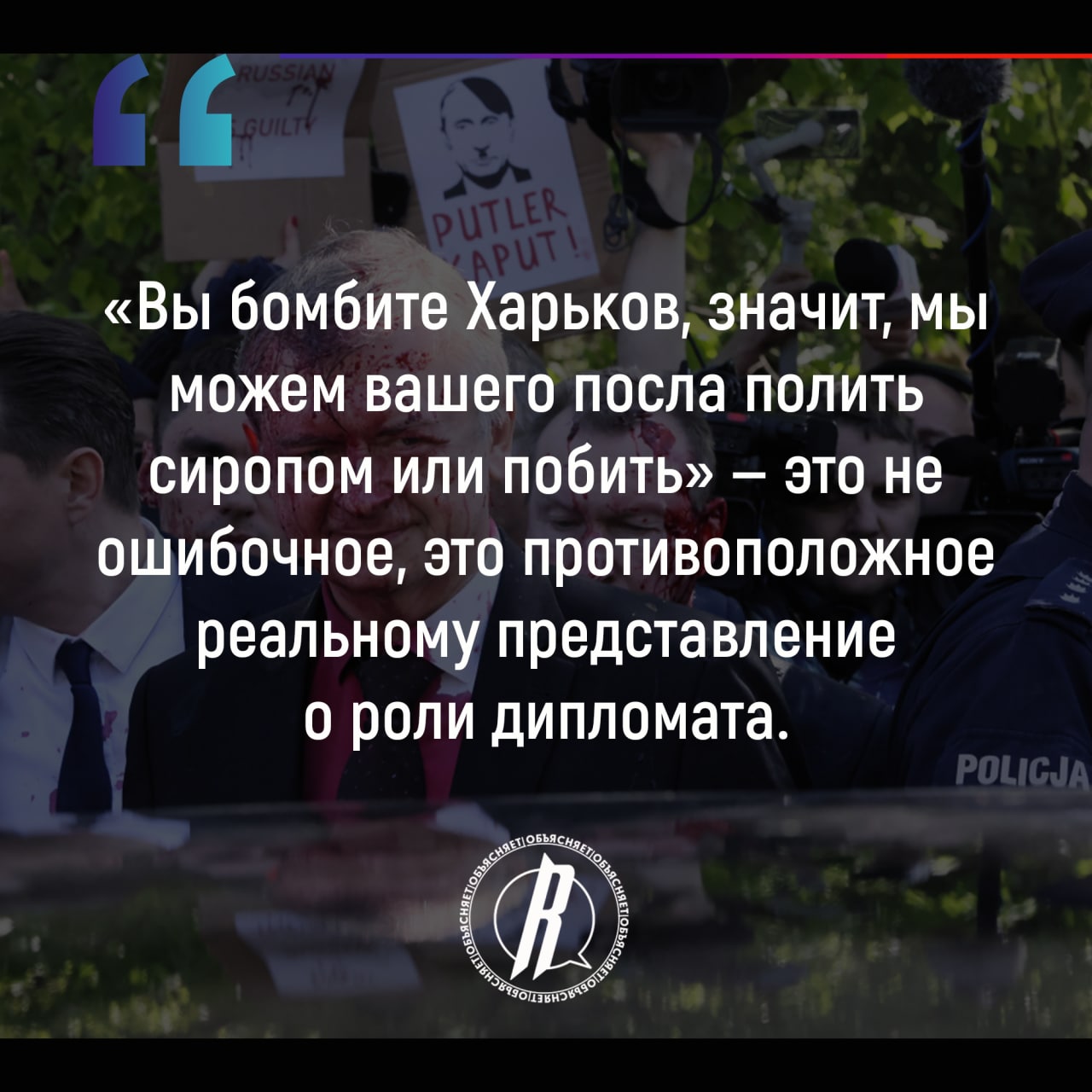 Нынешнее нападение на российского посла в Польше — это мелкое звено в большой цепи. На Украине не понимали никогда, но теперь и в Европе разучились понимать одну важную вещь. Посол, дипломат вообще — нужен не для того, чтобы быть приятным парнем и нужен не для ситуаций, когда все друг друга любят. Его роль становится действительно важной именно в неприятных, острых, даже опасных ситуациях. «Вы бомбите Харьков, значит, мы можем вашего посла полить сиропом или побить» — это не ошибочное, это противоположное реальному представление о роли дипломата.