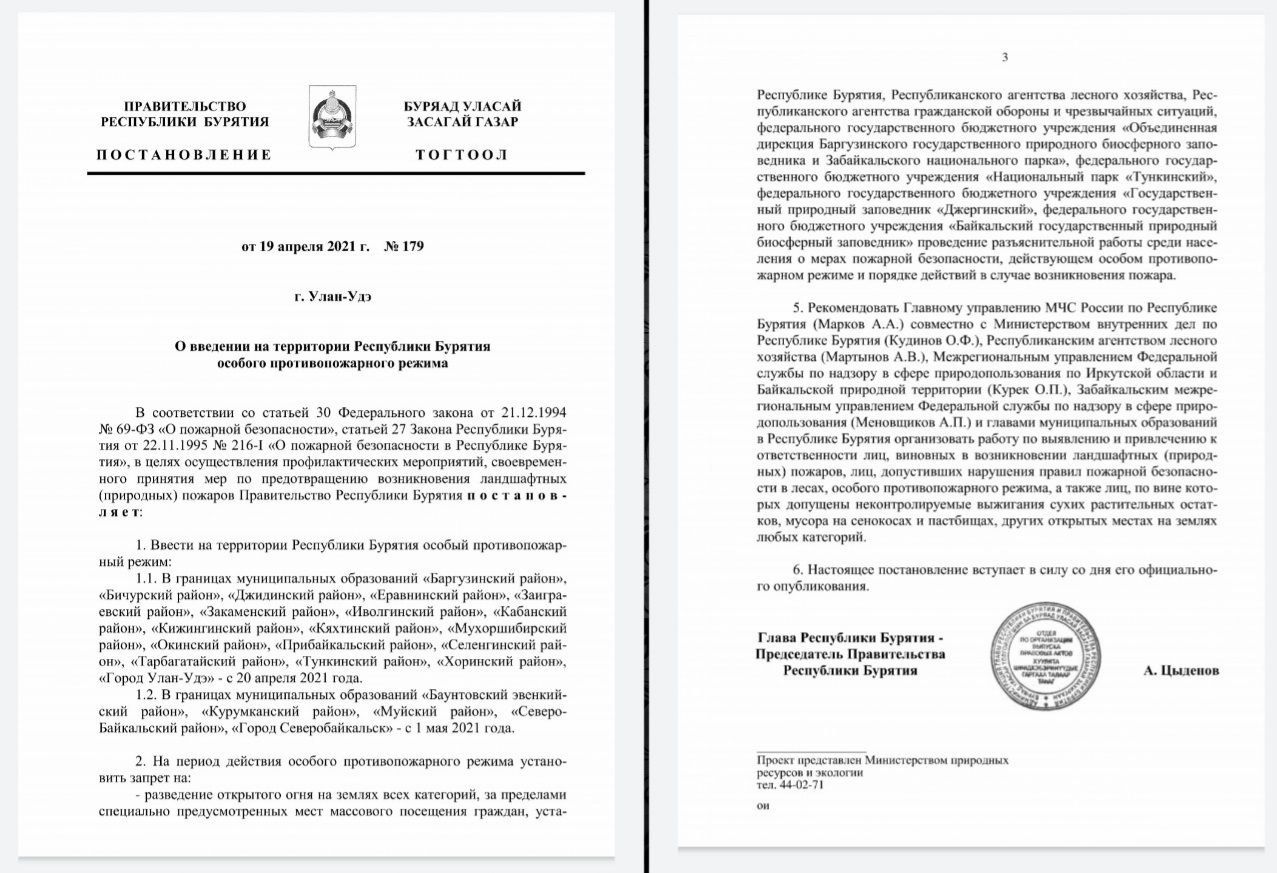 Глава Бурятии Алексей Цыденов, привлеченнный к административной ответственности за розжиг костра во время отпуска в Тункинском районе, нарушил подписанное им же как председателем правительства Бурятии постановление № 179 от 19 апреля 2021 года "О введении на территории Республики Бурятия особого противопожарного режима".