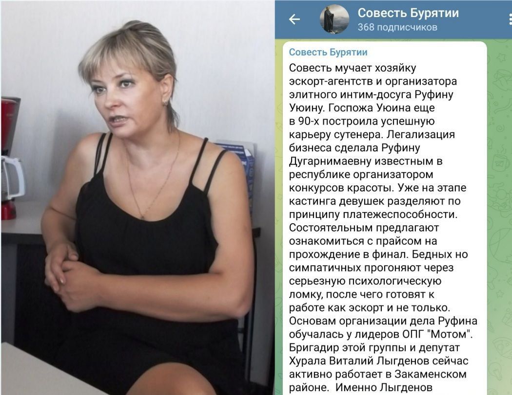 Именно Савченкова с Цыреновым, двигая Руфину в Хурал (естественно, небесплатно) в 2018 году, одновременно полоскали её как эскортницу через свой карманный канальчик "Совесть Бурятии", о котором мы уже писали. Именно этот пост (см. скриншот), а не информация силовиков, стал сегодня основным источником тенденциозной информации про Уюину, на который сослались все, кто писал на эту тему. Вот за что бы спросить Руфе с "черной вдовы" и БДЦ!