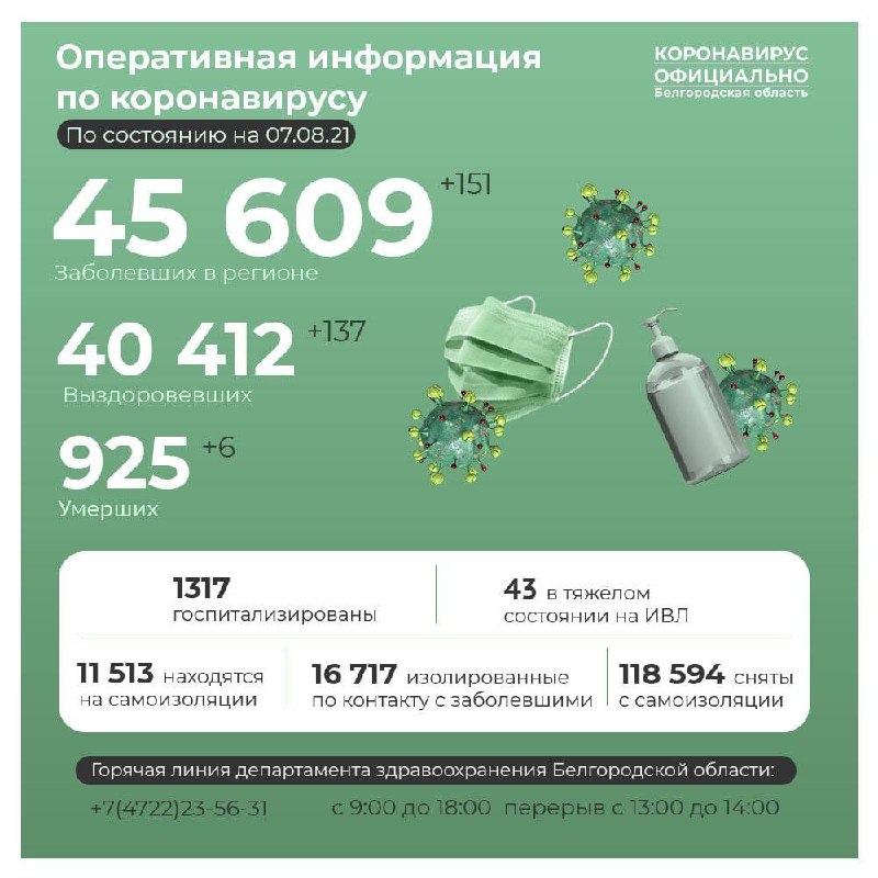 За сутки в регионе коронавирусом заболел 151 житель Белгородской области. Шесть человек умерло: в Белгороде, Губкине, Старом Осколе и Короче.