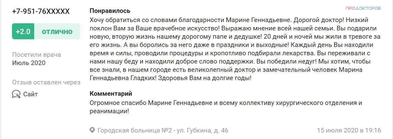 А пока просто оставим здесь один из комментариев от благодарных пациентов Гладких. Судя по отзывам, Мария Геннадьевна была хорошим врачом.