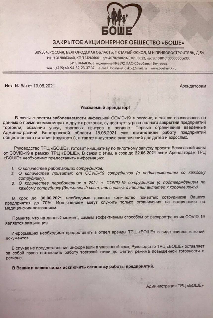 В Старом Осколе руководство ТРЦ «Боше» разослало своим арендаторам письмо, в котором просит отчитаться до 22 июня о количестве привитых сотрудников. Вместе с этим нужно прислать общее количество сотрудников и тех, кто имеет антитела к коронавирусу.