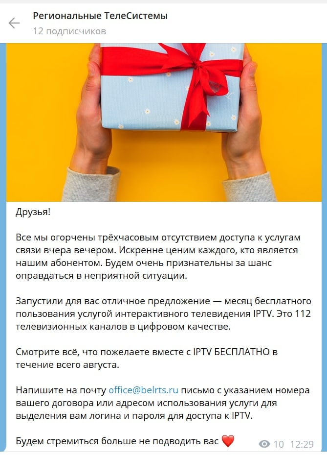 Классный кейс от провайдера «Региональные телесистемы», который пришёл в телеграм.