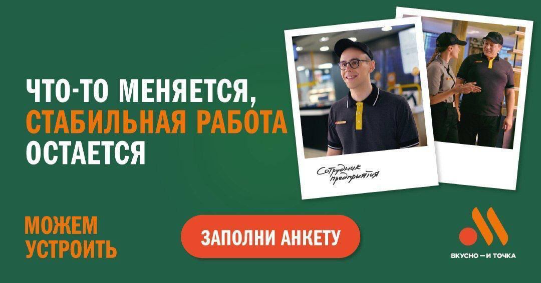 В сеть предприятий быстрого обслуживания «Вкусно – и точка» требуются сотрудники. Зарплата — 38 000 рублей/месяц.