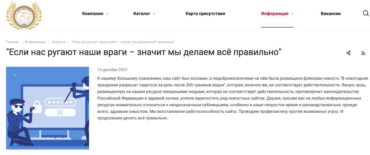 Подробно: гендиректор компании «Белвино» Сергей Лысенко рассказал, что сайт компании был взломан, а новость с заголовком «В новогодние праздники разрешат садиться за руль после 200 граммов водки» разместили недоброжелатели.