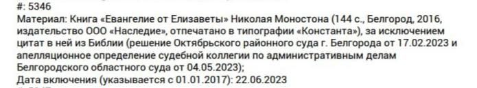 Книга «Евангелие от Елизаветы» белгородской типографии «Константа» теперь внесена в список экстремистских материалов Минюста РФ.