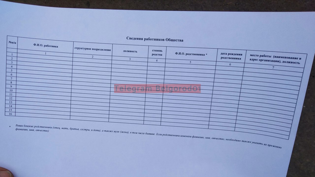 Подписчик «Белгород №1» сообщает, что такие бланки раздали всем сотрудникам и требуют заполнить их. А внутри — поля для информации обо всех родственниках и даже бывших супругах (не шутка).