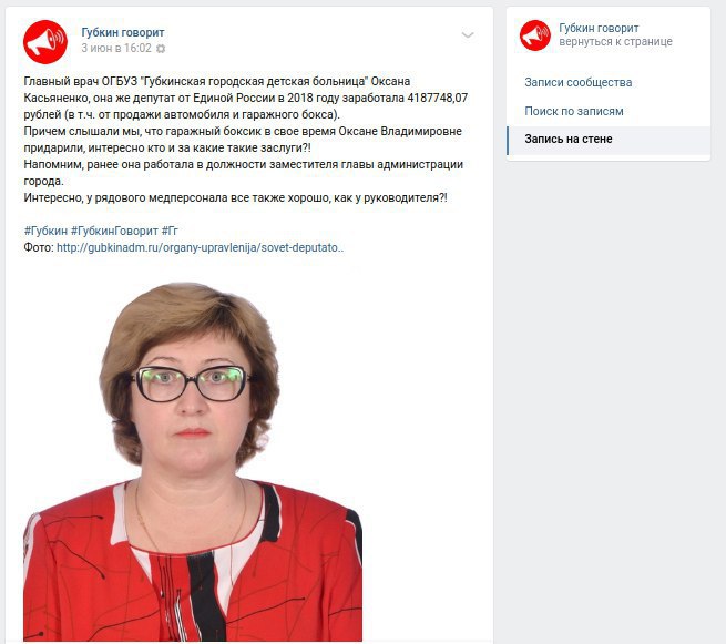 Депутат от «Единой России» из Губкина, главврач городской детской больницы Оксана Касьяненко попросила полицию возбудить уголовное дело на редакторов местного паблика — по статье о клевете.