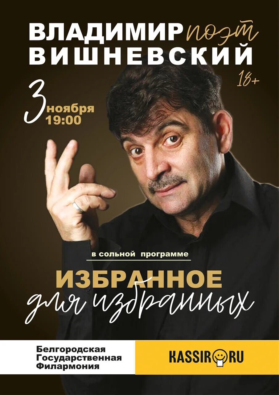 Билеты на сольную программу «Избранное для избранных» уже в продаже. Купить и подешевле, и подороже можно здесь: https://belgorod.kassir.ru/koncert/vladimir-vishnevskiy