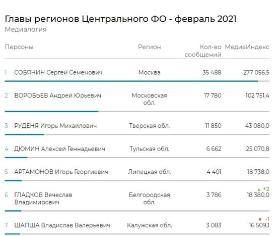 По итогам февраля 2021 года Вячеслав Гладков расположился на 6 месте среди глав ЦФО в рейтинге «Медиалогии», продвинувшись на две строчки вверх.