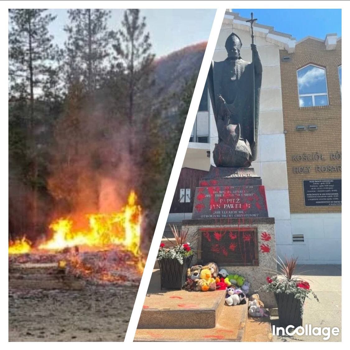 Ну и на десерт сторонники мирных методов в этот же день раскрасили статую папы Иоанна Павла II у храма в Эдмонтоне, провинция Альберта, красными отпечатками рук. Видео с секьюрити-камеры показало две машины, остановившиеся и наблюдающие за происходящим. Отдел по хейтерским преступлениям и экстремизму уведомлен, но пока он оценит обстановку и убедится, что акт вандализма проходит действительно по их ведомству, дело будет находиться в полиции.