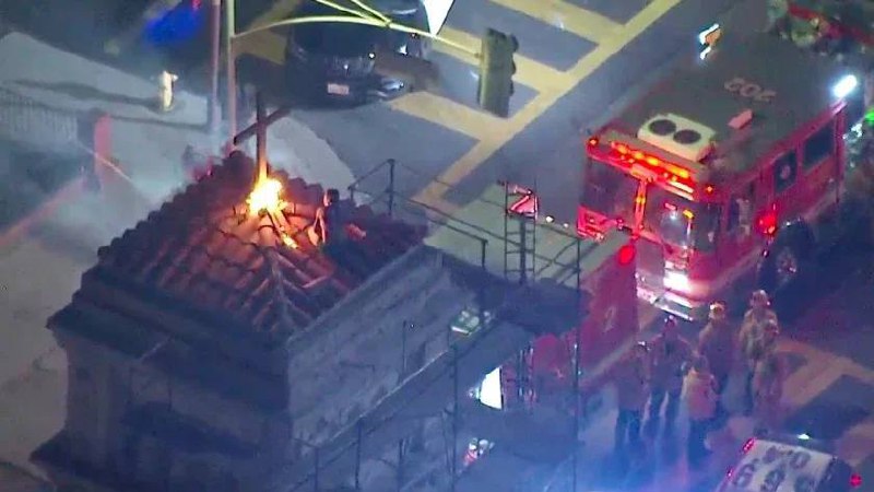 В четверг мужчина залез с помощью технического кабеля на 40-метровую колокольню католического храма св.Марии в Лос-Анжелесе. В зубах он держал баночку из-под таблеток (видимо, с горючим веществом).