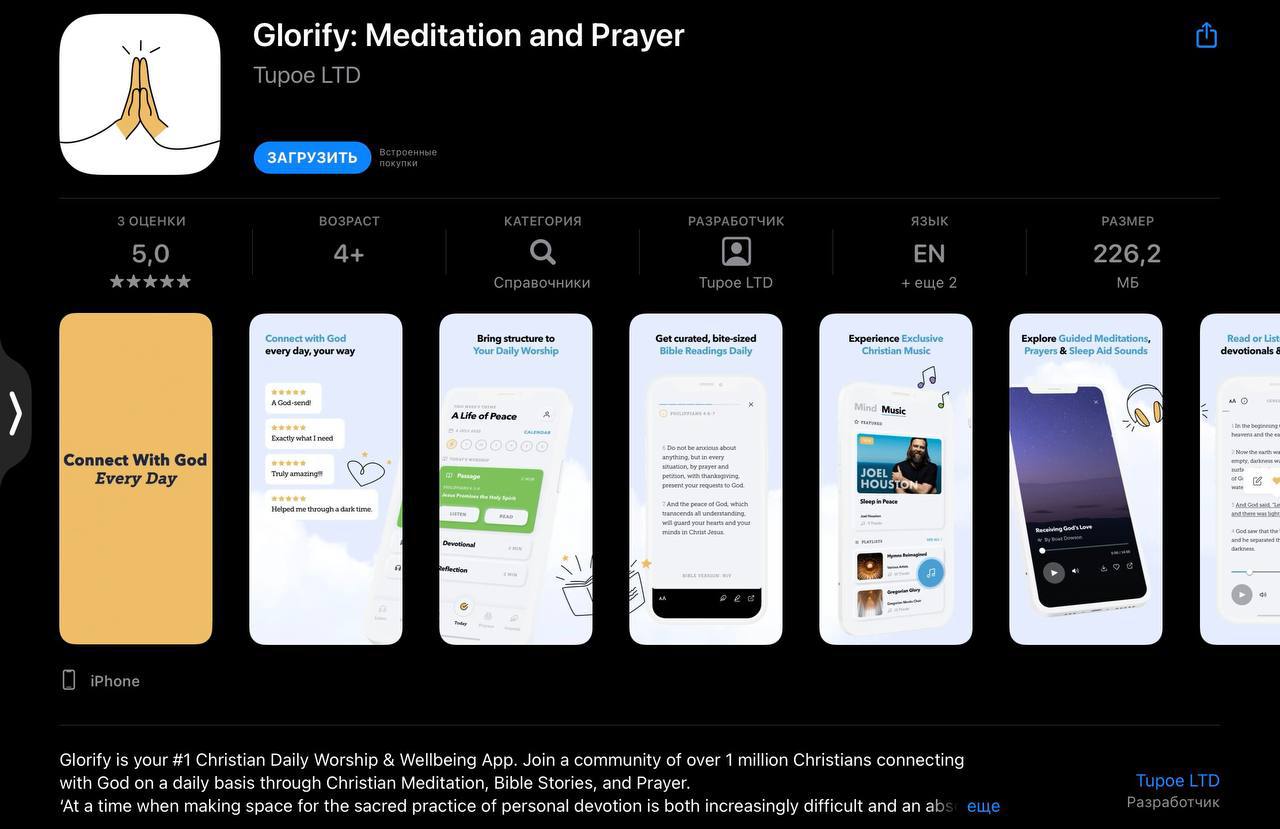 Подобные приложения расцвели пышным цветом во время пандемии. Glorify было разработано компанией с забавным для отечественного уха названием «Тупое LTD». Подзаголовок гласит: «Религия и эмоциональное благополучие (Worship and Well-being). За 9.49$ в месяц приложение предлагает: успокоить душу медитацией, умиротворить и улучшить качество сна; исследовать Библию от Книги Бытия до Откровения; структурировать ежедневное молитвенное правило и многое другое.