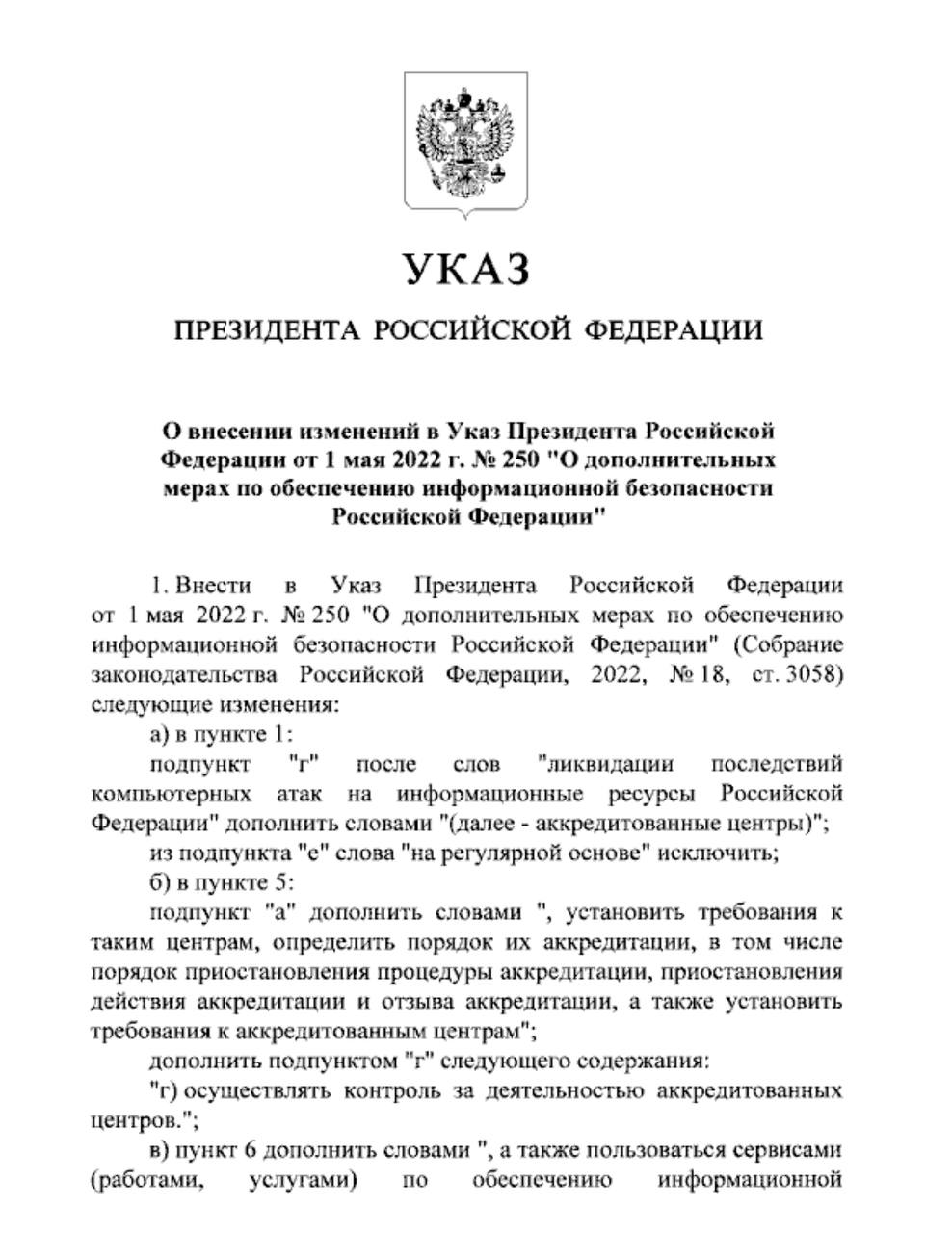 «О внесении изменений в Указ Президента Российской Федерации от 1 мая 2022 г. № 250 «О дополнительных мерах по обеспечению информационной безопасности Российской Федерации».