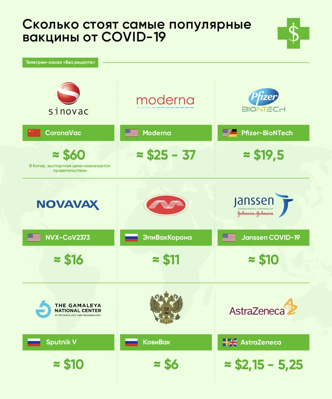 • CoronaVac – самая загадочная из вакцин. Результаты клинических тестов разнятся от страны к стране. Цены на нее тоже устанавливают далеко не рыночным методом. На экспорт она идет по ценам от государства. Для друзей КНР, само собой, скидка.