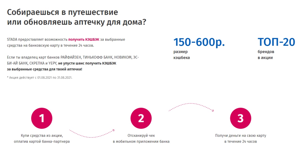STADA неожиданно запускает кэшбэк с покупки лекарств. Для российского рынка предложение довольно уникально – обычно возвращение средств за препараты предлагают аптеки или страховые полисы. Рассчитана программа на пользователей банковских приложений, например, "Тинькофф" или "Новикомбанка".