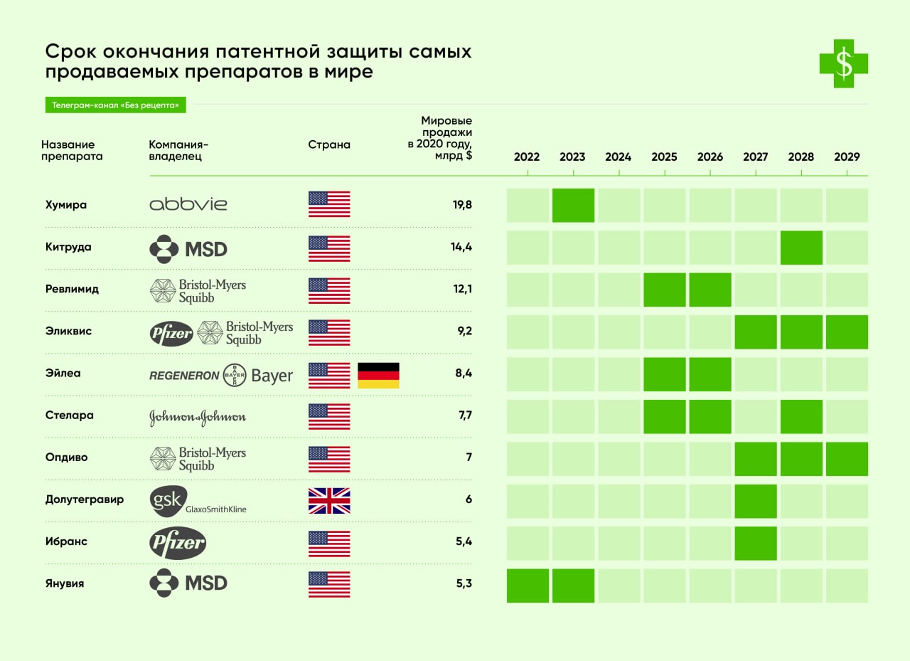 • Антикоагулянт Эливикс в прошлом году собрал кассу на фоне участившихся случаев тромбоза из-за коронавируса. Формально дженерики могут начать выходить на рынок уже в 2026 году, но патент на формулу будет держаться до 2031 года. Пока Pfizer и Bayer удавалось выигрывать все суды.
