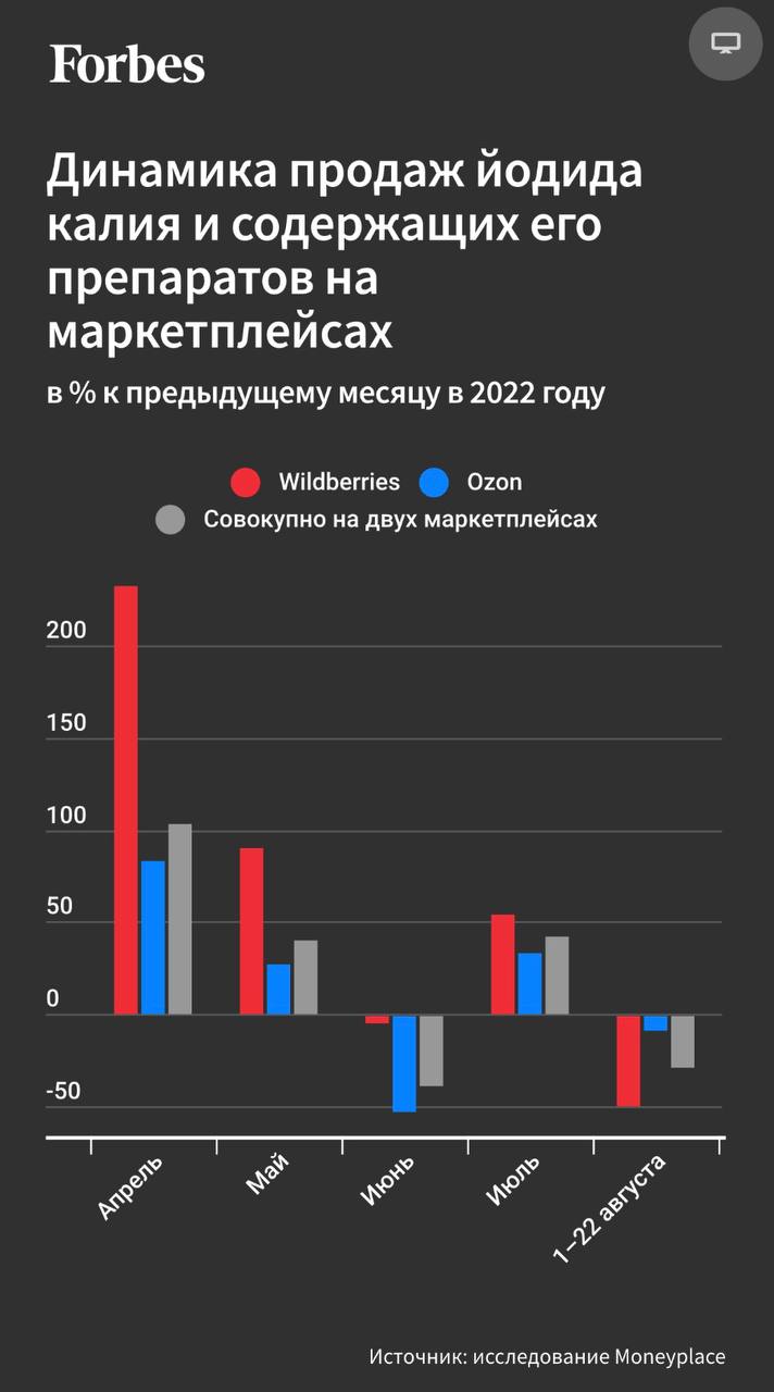 Объем продаж йодида калия и содержащих его препаратов на маркетплейсах Ozon и Wildberries вырос на 103% в апреле по сравнению с мартом, на 40% в мае по сравнению с апрелем и на 42% в июле по сравнению с июнем. В июне, правда, оборот упал на 38% к маю, а за период 1–22 августа — на 28% к июлю.