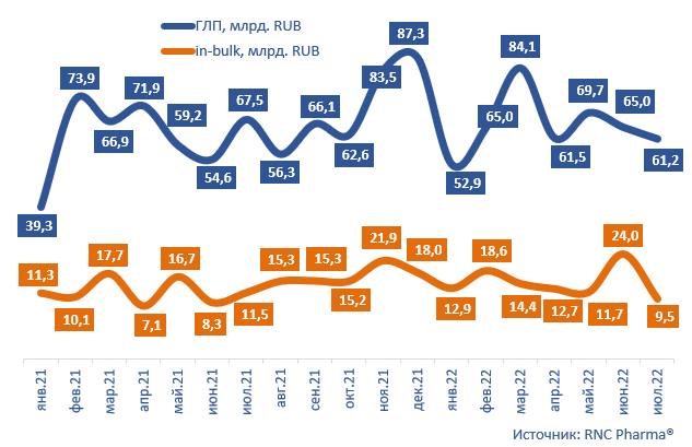 Отгрузки in bulk (нерасфасованных препаратов) сократились еще сильнее — на 32,4%. Общий объем поставок составил 903,2 млн МЕД.