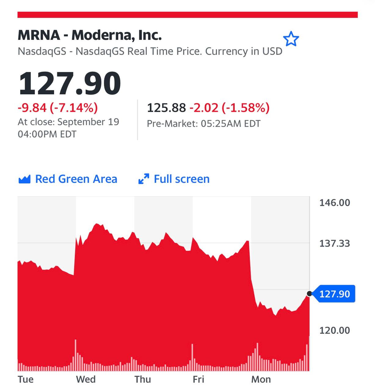 На утро понедельника акции большинства фармгигантов начали сильно терять в цене. Бумаги Moderna по итогам торгов 19 сентября упали в цене на 7,26%, закрывшись на отметке $127,9 за акцию. Бумаги Novavax обвалились на 6,51%, до $28,43 за акцию, бумаги BioNTech — на 8,6%, до $133,22 за бумагу, Pfizer — на 1,28%, до $45,44 за бумагу, свидетельствуют данные закрытия торгов американских бирж.