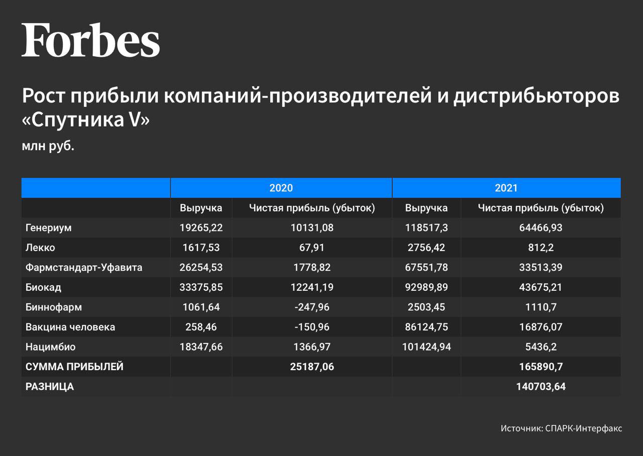 Производители и дистрибьюторы Спутника V увеличили прибыли в 6 раз в 2021 (данные Forbes).