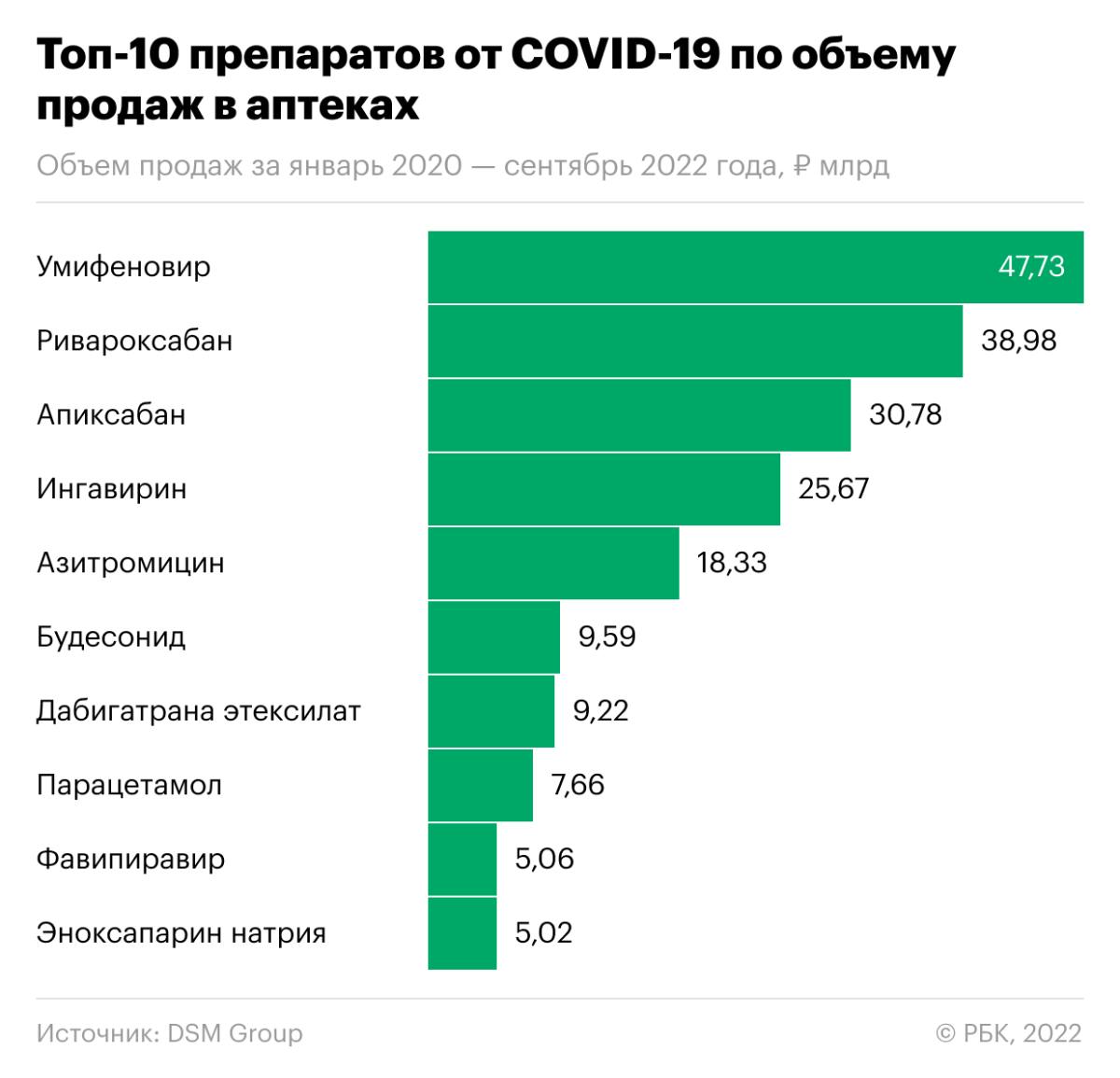 Стоит отметить повышенный спрос на антибиотики и антикоагулянты, которые многие заболевшие принимали самостоятельно, прочитав заявления об их эффективности в СМИ и интернете. Если в допандемийном 2019 объем их реализации составил 38 млрд рублей, то в 2020— 66,4 млрд, 2021 — 82,5 млрд. А за девять месяцев этого года — 57,6 млрд рублей.