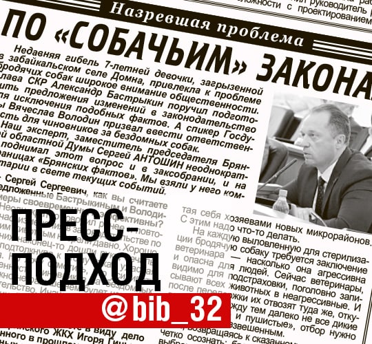 Зампредседателя Брянской областной Думы Сергей Антошин непримиримо высказался по «собачьему вопросу» на страницах сегодняшних «Брянских фактов». Высказался в свете трагедии в Забайкалье, но, как утверждает газета, уже не в первый раз – что отводит от вице-спикера подозрения в желании хайпануть на горячем.