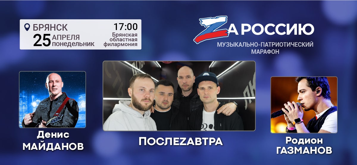 Шанс узнать поёт ли в свои 40 лет песню «Люси» Родион Газманов и есть ли у него в репертуаре другие композиции, познакомиться с коллективом «Послеzавтра»и услышать вживую депутата Госдумы Дениса Майданова представится нам, бряне, 25 апреля (но не точно).