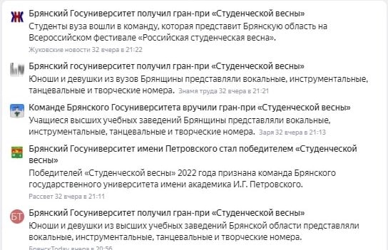 «В Брянске 29 апреля прошел гала-концерт областного этапа конкурса «Студенческая весна - 2022». О нем было заранее известно организаторам, которым подчиняется масса местных сайтов. Отчего-то ни 29, ни 30 апреля брянские интернет-сми не уделили итогам фестиваля толики своей драгоценной площади. И только спустя пять дней, когда информация о гала-концерте появилась на сайте БГУ, несвежую новость оттуда перепечатал «Тудей», а за ним подхватили остальные, вплоть до сайтов районок.
