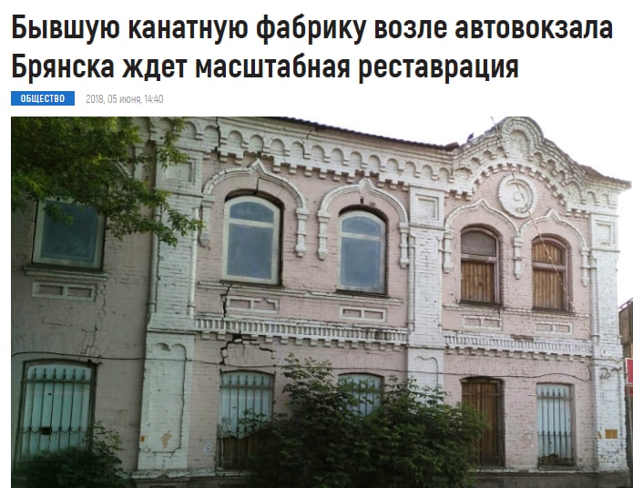 Давеча в очередной раз пообещали вот-вот отреставрировать руины канатной фабрики в районе брянского автовокзала. По странному стечению обстоятельств, информация появилась практически день-в-день с сообщением четырехлетней давности о том же самом. Тогда (см. скрин) фабрику тоже ждала реставрация, да не простая, а масштабная.