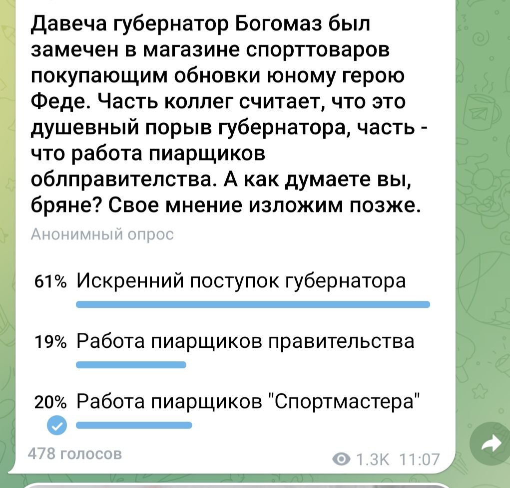 Что ж вы так плохо думаете о пиарщиках областного правительства, бряне? В нашем опросе о походе губернатора Богомаза и мальчика Феди за покупками накидали им голосов меньше, чем «Спортмастеру»!