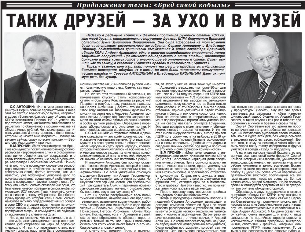 Мы про эпичный холивар между депутатами облдумы, в рамках коего «Брянские факты» давеча напечатали статью «Таких друзей - за ухо и в музей». Под друзьями подразумевается прореженная арестами и прогулами фракция КПРФ в региональном заксобрании. А сам материал является сиквелом эпичного материала «Бред сивой кобылы» пера редактора «БФ» и вице-спикера облдумы Владимира Пронина.