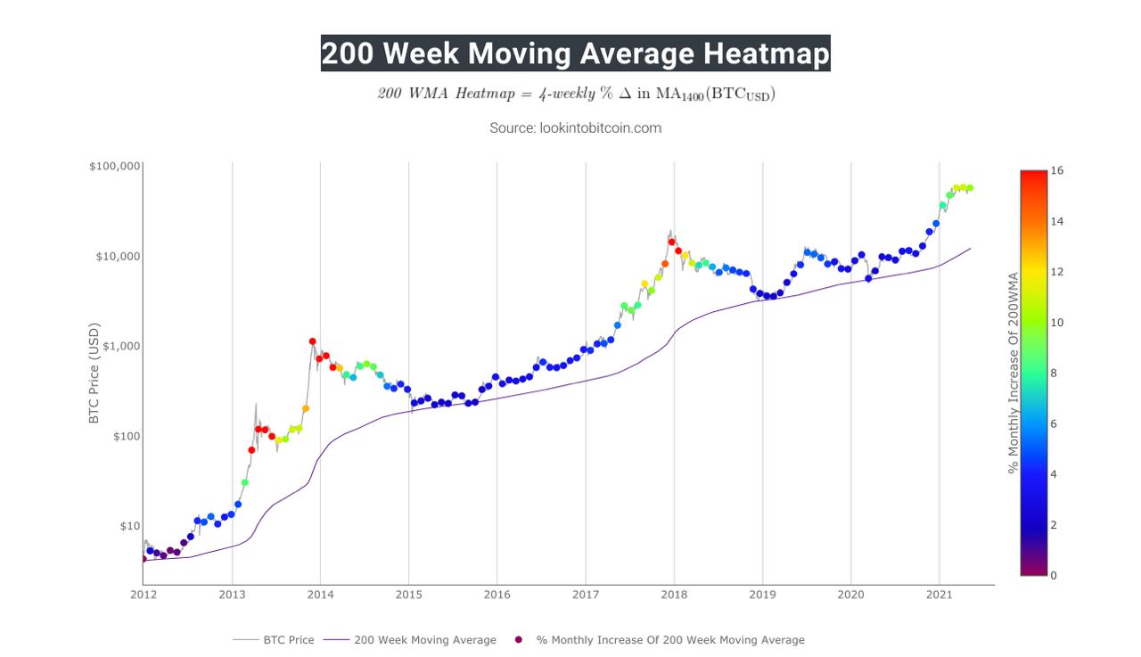 Долгосрочные биткоин-инвесторы могут следить за ежемесячными изменениями цвета. Исторически, когда мы видим оранжевые и красные точки на ценовом графике, это хорошее время для продажи биткоина, поскольку рынок перегрет. Периоды, когда ценовые точки фиолетовые и близки к 200-недельной МА, исторически были хорошим временем для покупки.