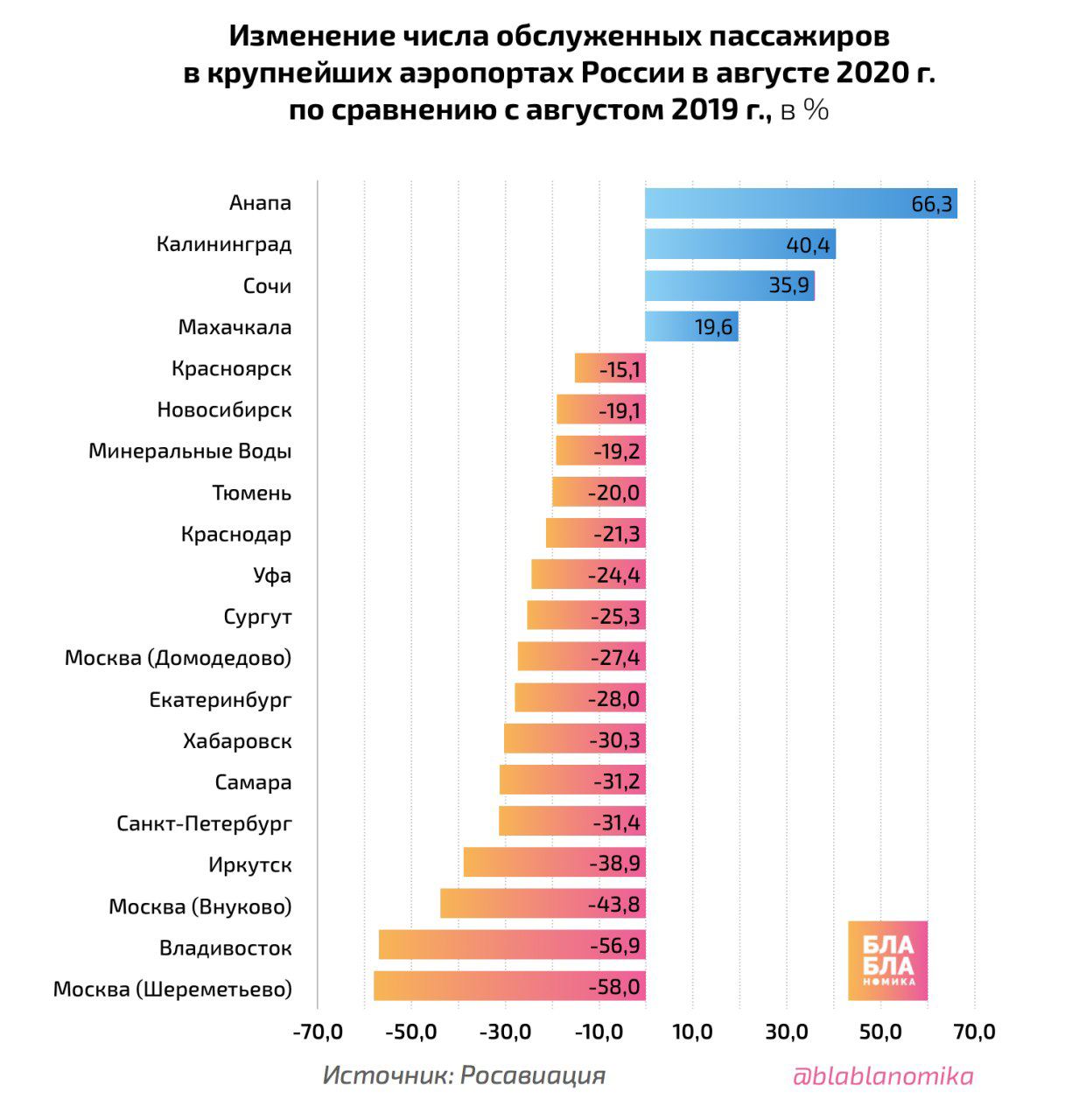 На внутрироссийских маршрутах число перевезённых пассажиров в августе 2020 г. выросло на 5,7% по сравнению с августом 2019 г. Однако рост произошёл за счёт очень немногих направлений. Среди аэропортов с числом обслуженных пассажиров более 150 тыс., по которым Росавиация представила данные, число пассажиров в августе этого года выросло лишь в Анапе, Сочи, Калининграде и Махачкале.