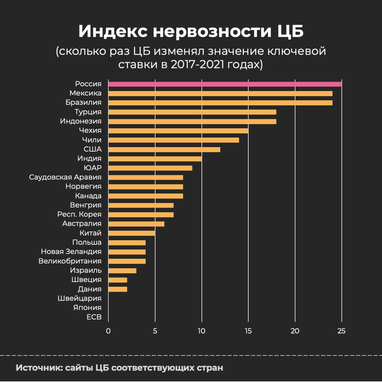 Конечно, отчасти место в рэнкинге – показатель уровня развития страны в целом. Но можно и по-другому посмотреть на причины и следствия. Для доверия к политике любого центрального банка важно, чтобы от его действий у всех формировалось ощущение уверенности. Но если центральный банк не может определиться с уровнем процентной ставки, робко озираясь по сторонам, формированию «заякоренных» инфляционных ожиданий это точно не поможет. А значит, и стабильных условий для бизнеса не будет.