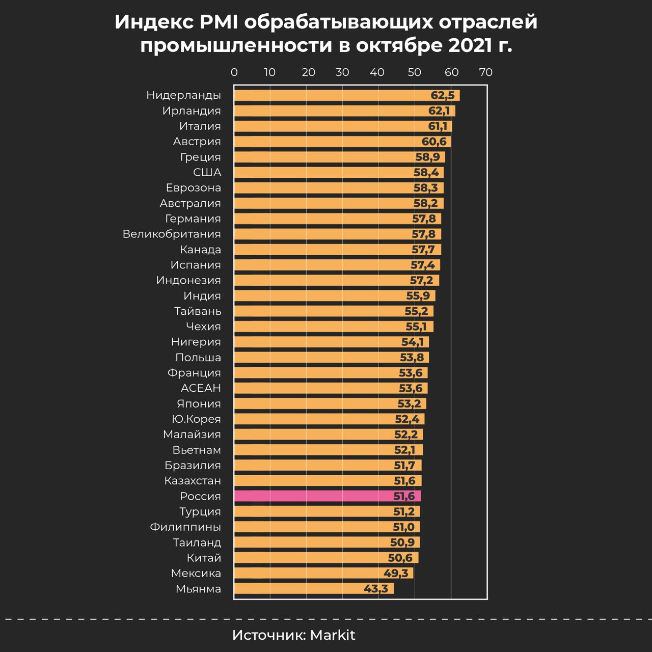 Уже который месяц мы вынуждены фиксировать и тот факт, что по уровню деловой активности Россия продолжает отставать от большинства стран мира, где проводится данное исследование. Так, PMI в США составил в сентябре 58,4 пункта, в странах еврозоны – 58,3 пункта, в странах АСЕАН – 53,6… В целом в лидерах числятся европейские страны – Нидерланды, Ирландия, Италия, Австрия, где PMI в октябре превысил 60 пунктов. К сожалению, российские производители не сообщают о сколь-либо заметном восстановлении ситуации в отличие от многих иностранных коллег. А ведь сейчас новый по сути локдаун уже идет.