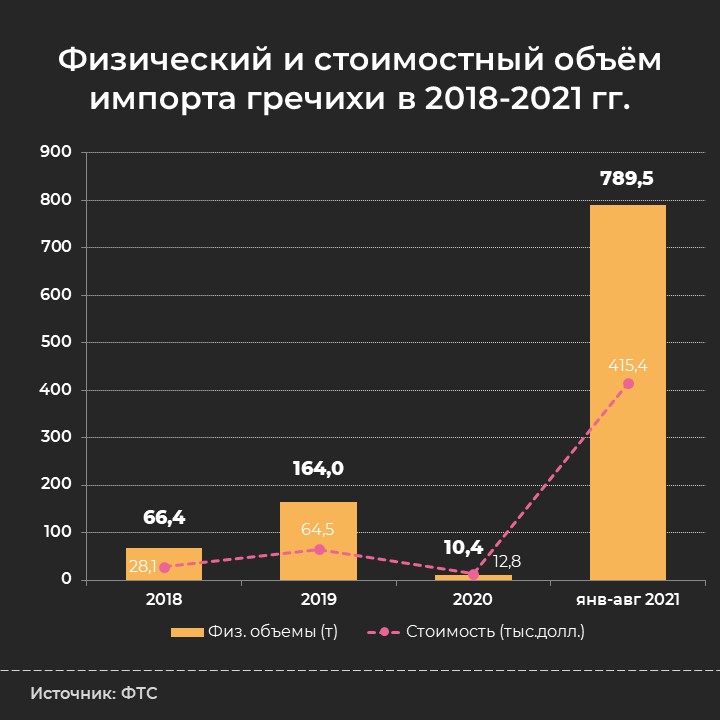 Между тем, импорт гречихи резко возрос. В прошлые годы объемы ввоза были незначительными, однако только за восемь месяцев текущего года импорт гречихи вырос почти в 80 раз по сравнению с объемами импорта за весь 2020 г. (790 т против 10 т). Гречихи уже закупили за рубежом почти на полмиллиона долларов.