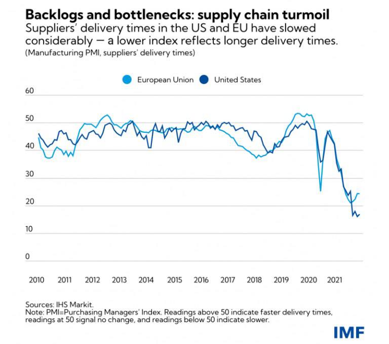 Понятно, что в такие моменты у поставщиков обычно появляется больше возможностей для повышения цен, кроме того, задержки в поставках влияют на доступность не только конечных потребительских товаров, но и промежуточных (таких, как автомобильные чипы), необходимых производителям для выпуска своих товаров. В сочетании с нехваткой рабочей силы, вызванной коронавирусными ограничениями на перемещение между странами, все эти факторы представляют собой гремучую смесь, ведущую к подрыву ценовой стабильности.
