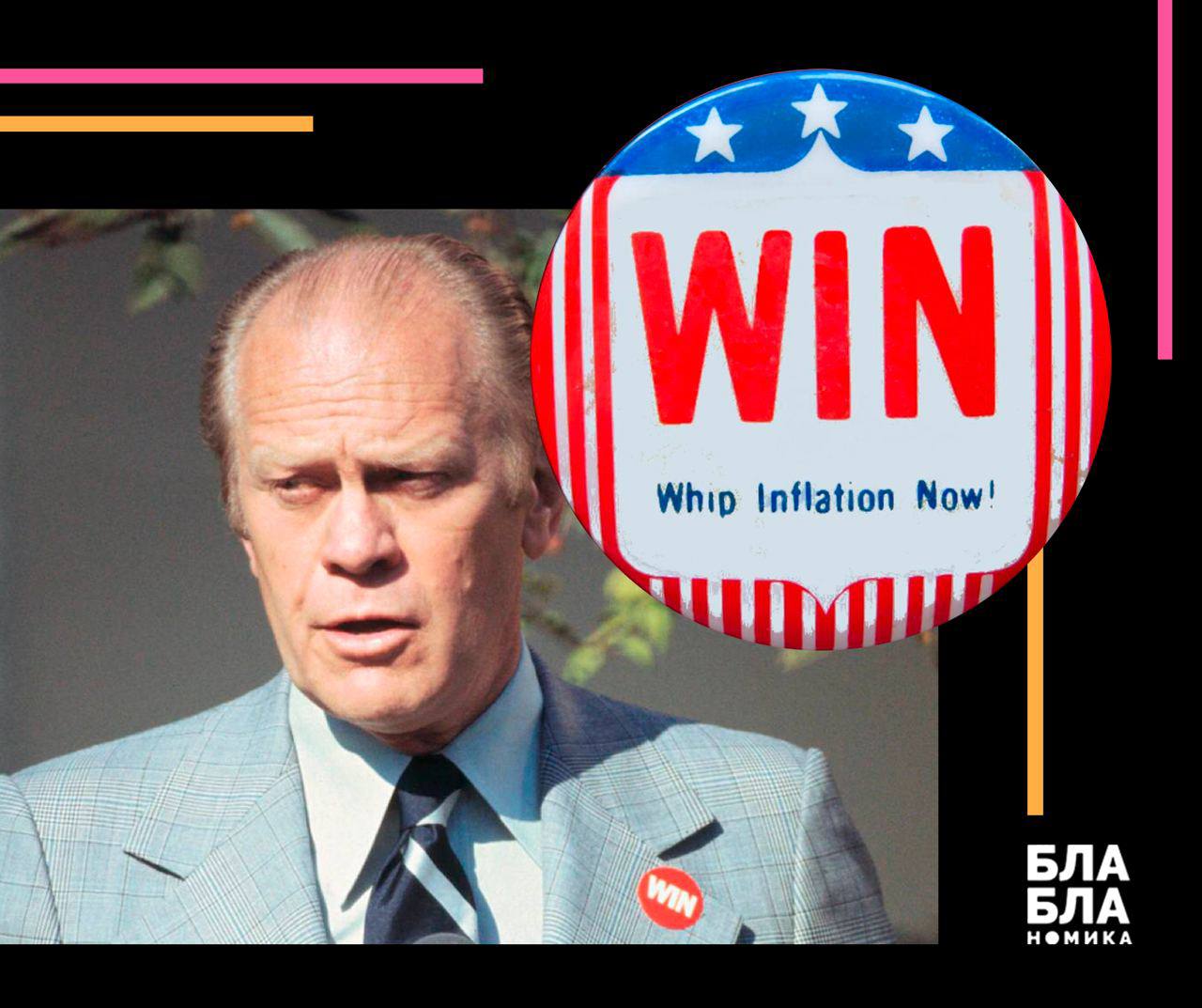 Джеральд Форд вместе с женой даже публично подписал обязательство потреблять как можно меньше. Ну и чтобы засвидетельствовать важность задачи борьбы с инфляцией, он решил носить на лацкане своего пиджака значок с надписью «WIN». А кампания, нацеленная на победу над инфляцией, получила название «Whip Inflation Now».
